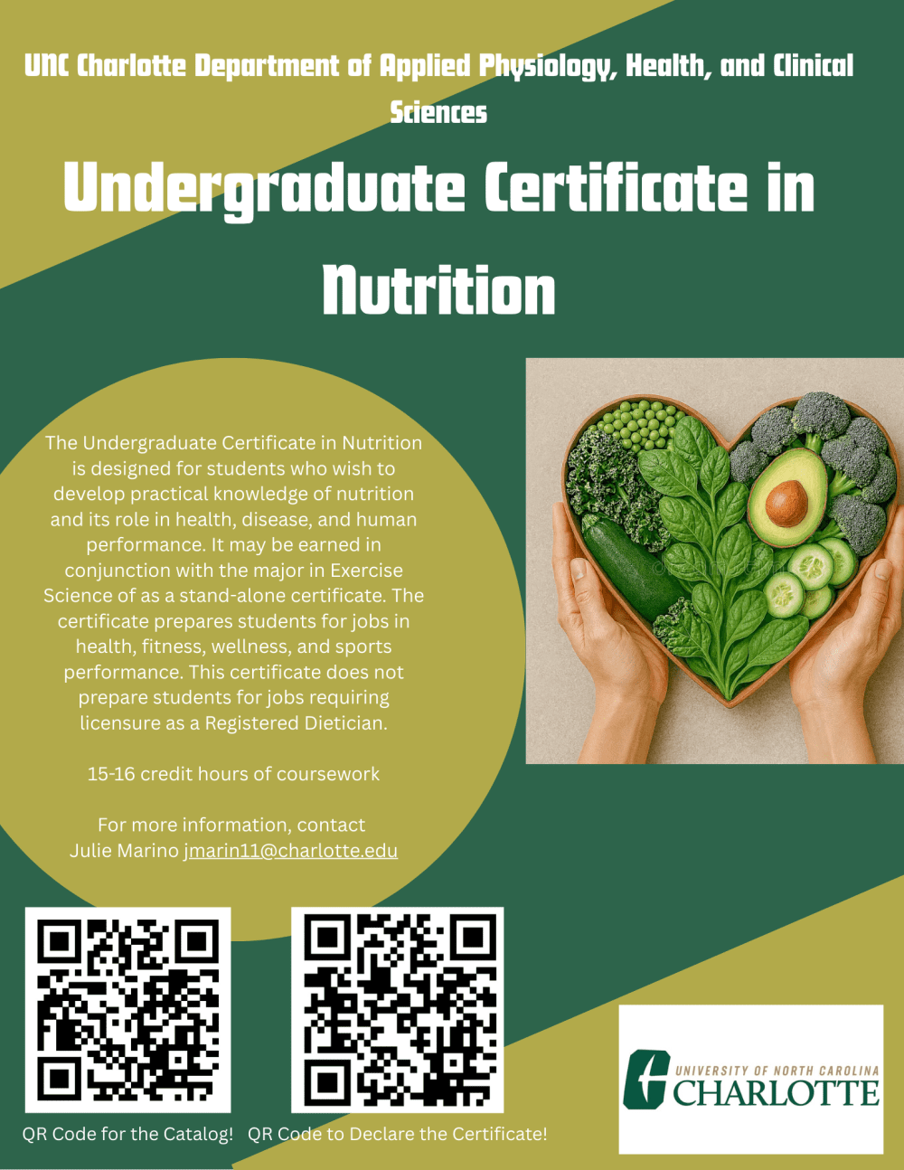 UNC Charlotte’s Undergraduate Certificate in Nutrition offers students practical, science-based knowledge about the role of nutrition in health, performance and disease prevention. Open to all majors, this 15-credit certificate prepares students for careers in fitness, wellness and sports performance—complementing degrees in fields like Exercise Science and Health Sciences. Through courses in applied nutrition, medical terminology and weight management, students gain real-world insight into how food and behavior impact the body. The certificate includes elective options in global food systems or hands-on internship experience. While not designed for those seeking Registered Dietitian licensure, this program provides a valuable foundation for anyone passionate about health and nutrition.